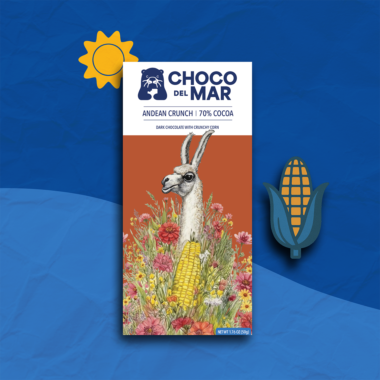 Corn has fed the Andes for thousands of years — toasted, boiled, brewed, even steamed in husks. In Ecuador, it’s not just food — it’s history. This bar is our little tribute: Costa Esmeraldas chocolate, scattered with crunchy bits of corn. Cleo calls it “beach food meets mountain soul.” We call it delicious.